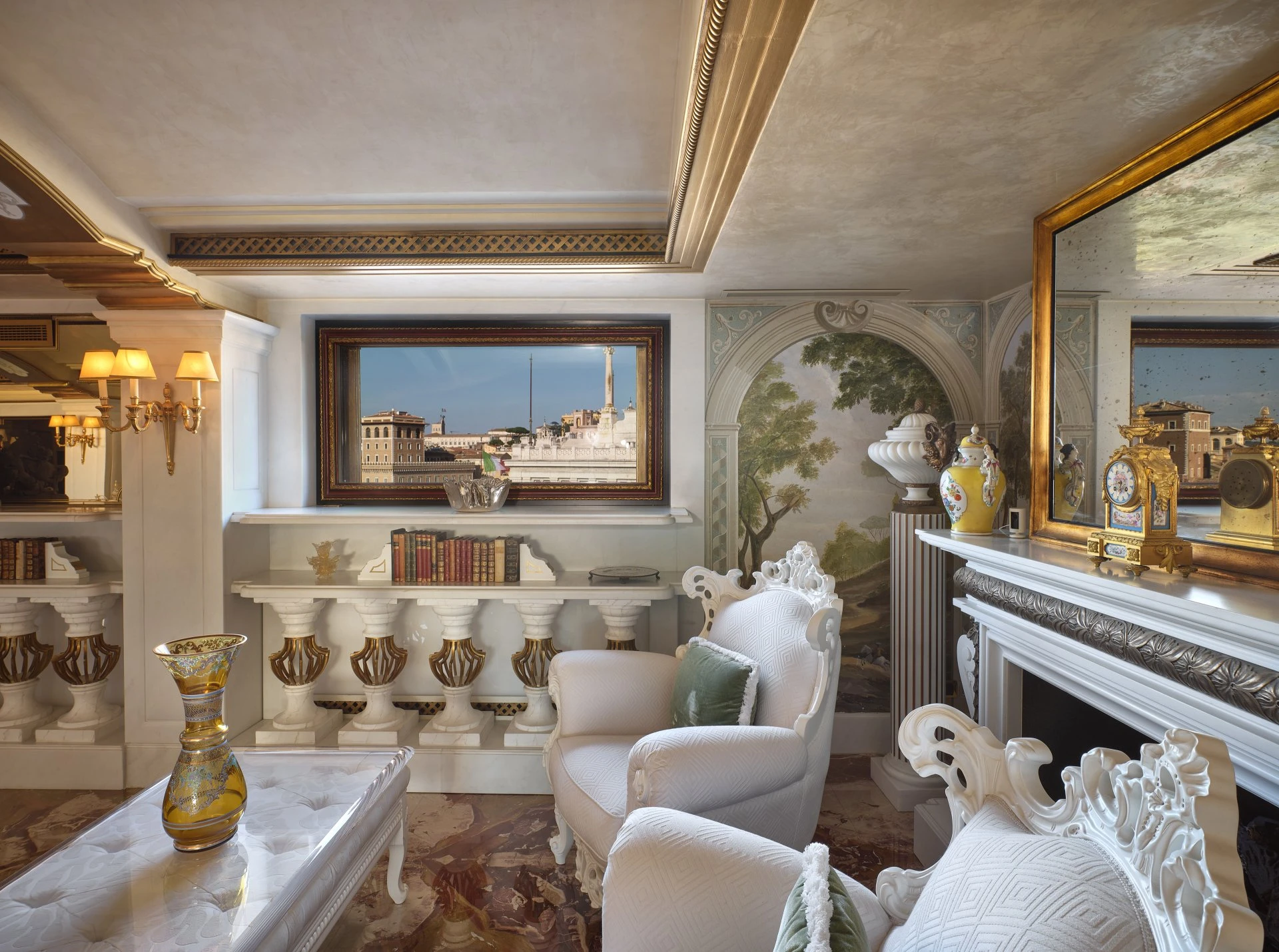 This majestic living room will take you back in time. Original frescoes and artworks frame the view of the Eternal City.