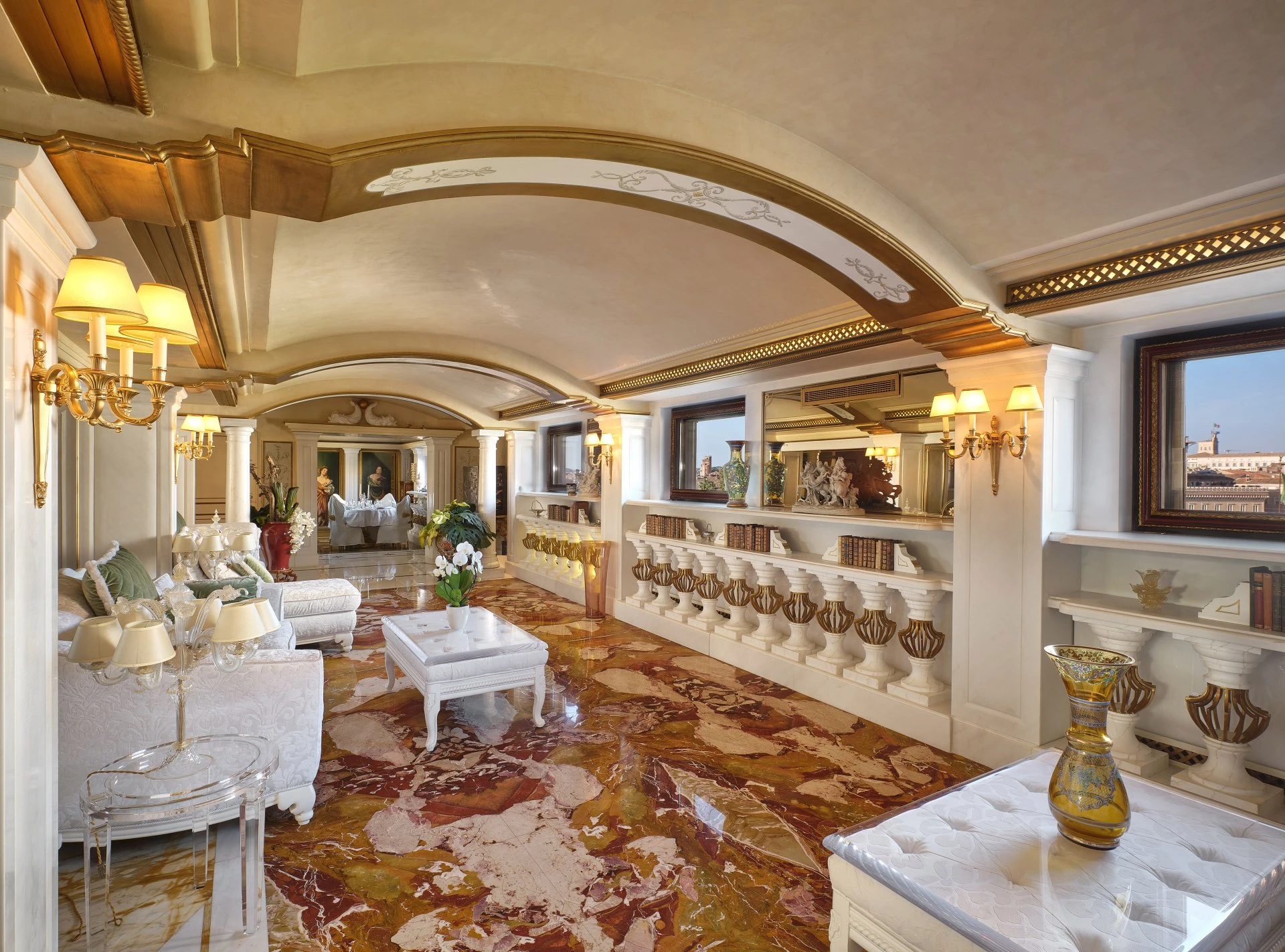 Welcoming you at the entrance is a sumptuous living room, enriched by hand-inlaid marble floors, sophisticated finishes, and original furnishings from the Roman era. Every window is a frame on Rome: the majestic figure of the Altare della Patria and the sumptuousness of the Campidoglio stand out.