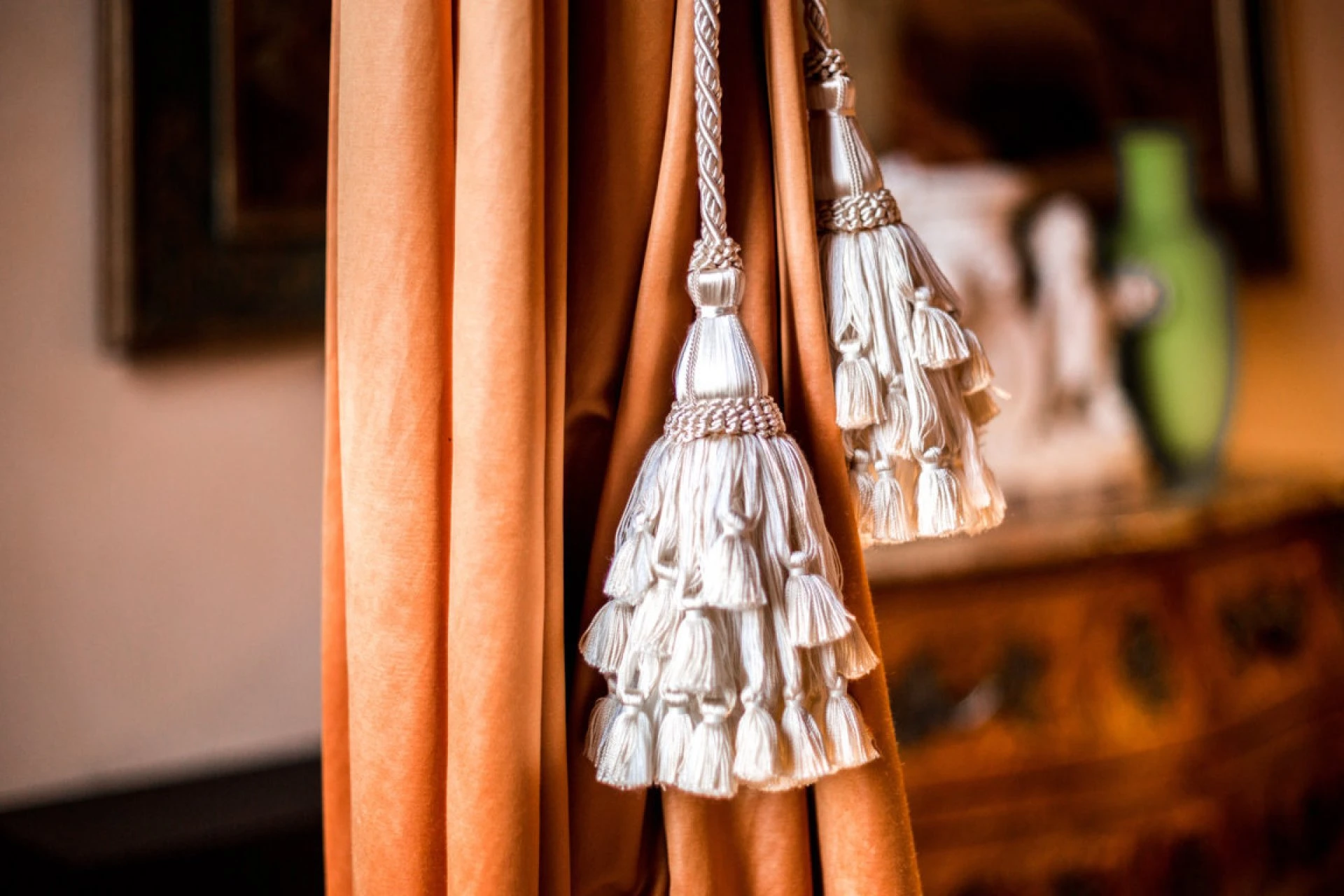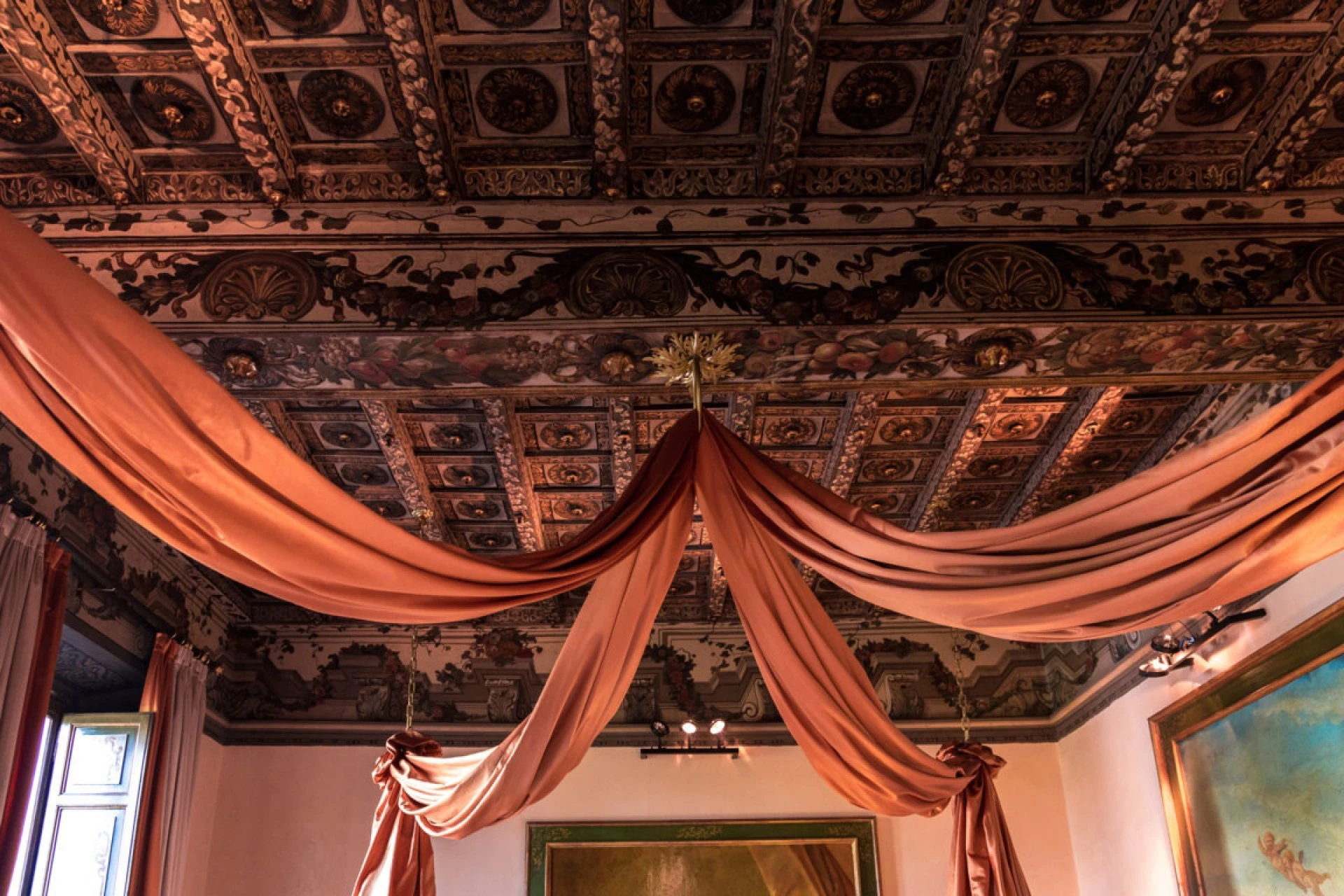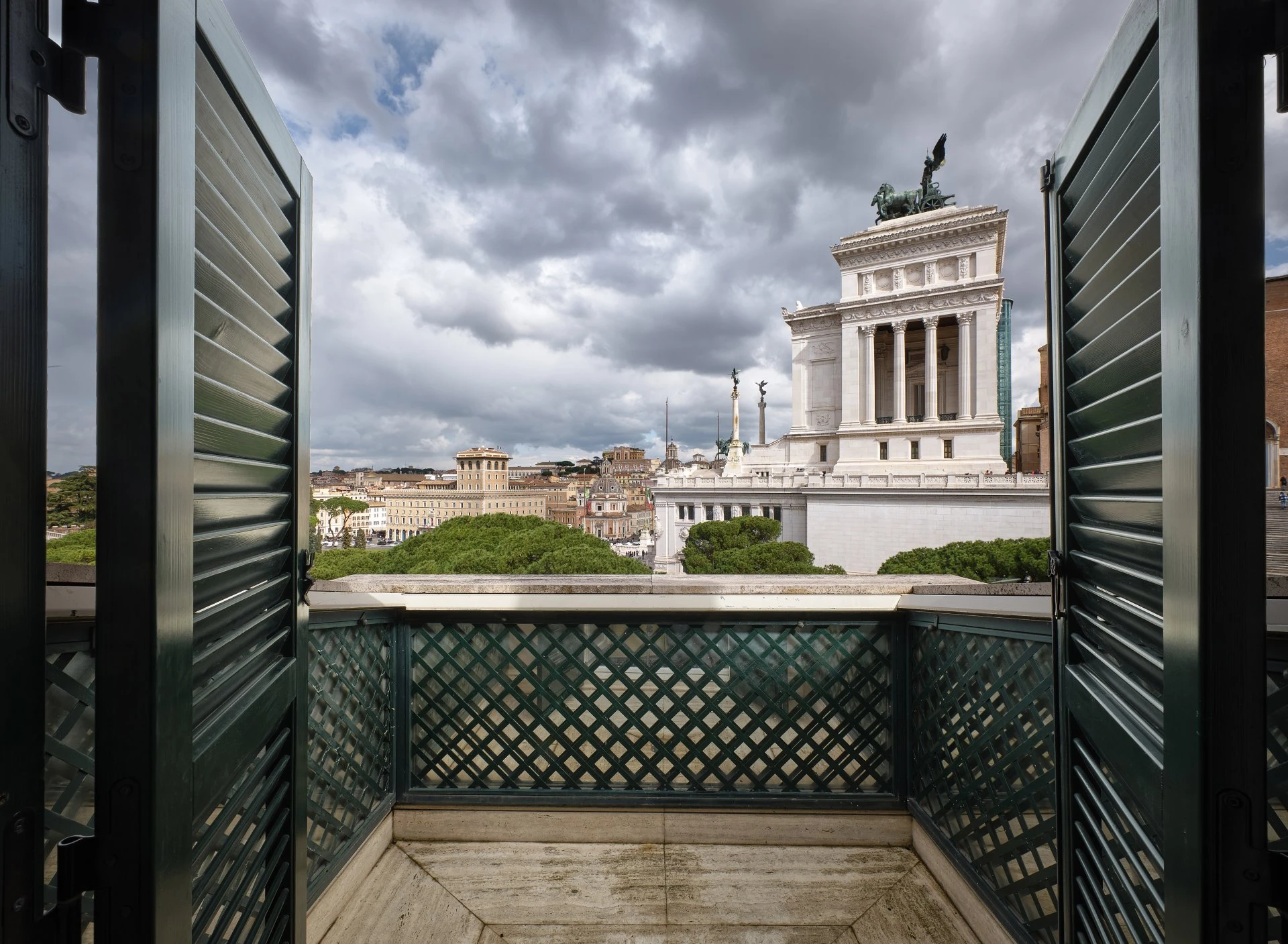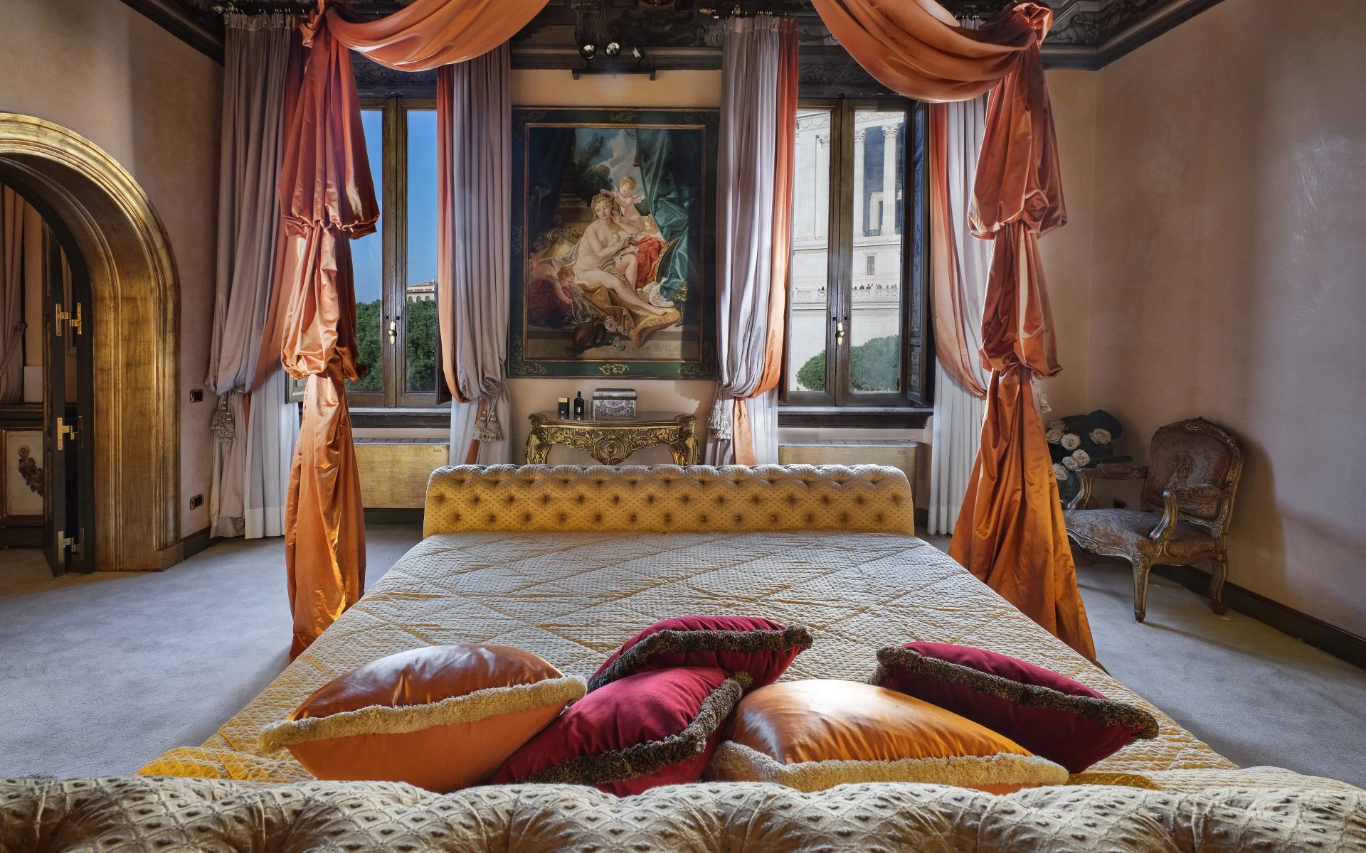The spacious bedroom is a jewel of Italian art, characterized by the original wooden ceiling, hand-carved, and the precious three-quarter canopy bed, from which you can enjoy the incredible view of the Altare della Patria.