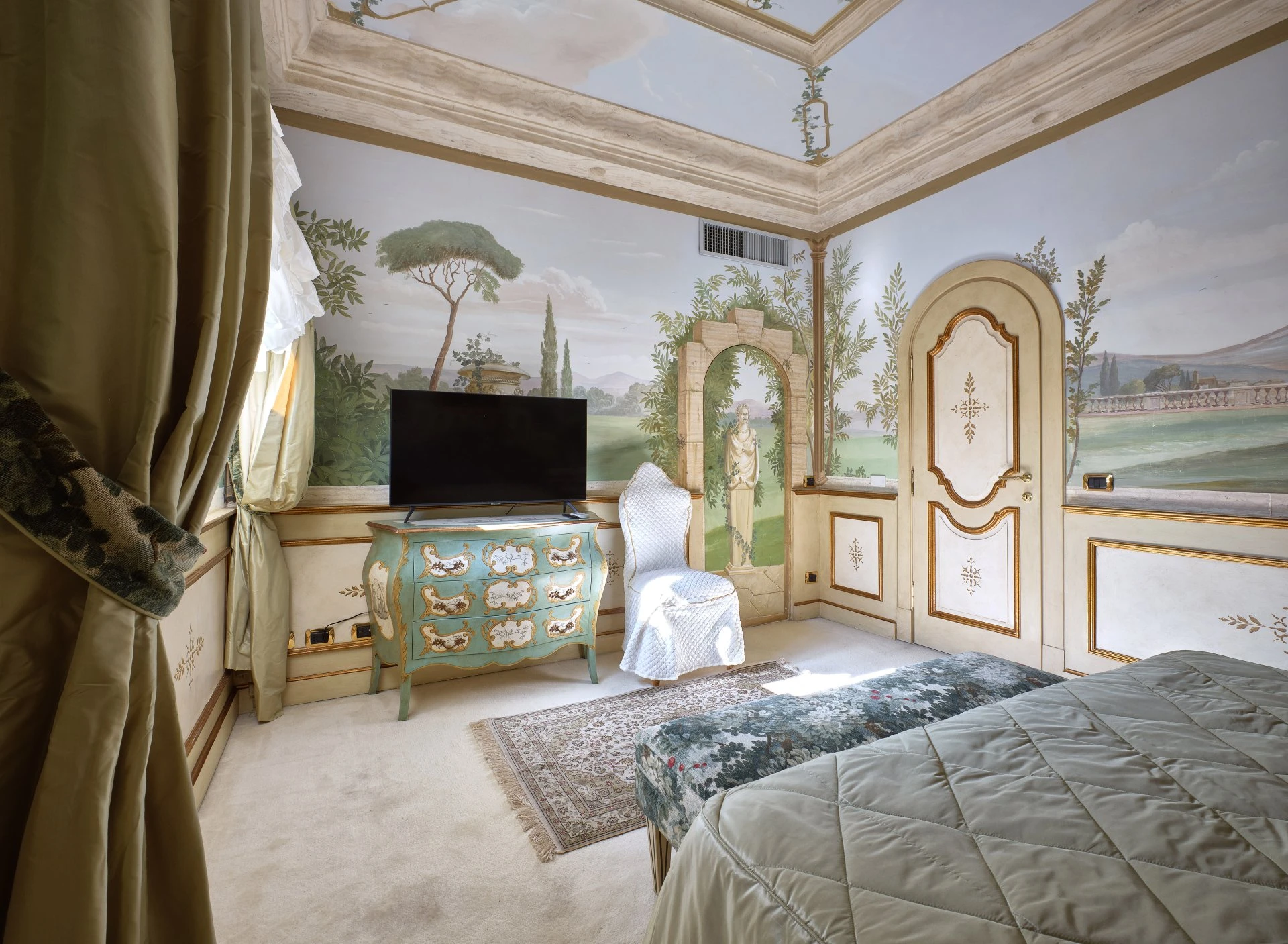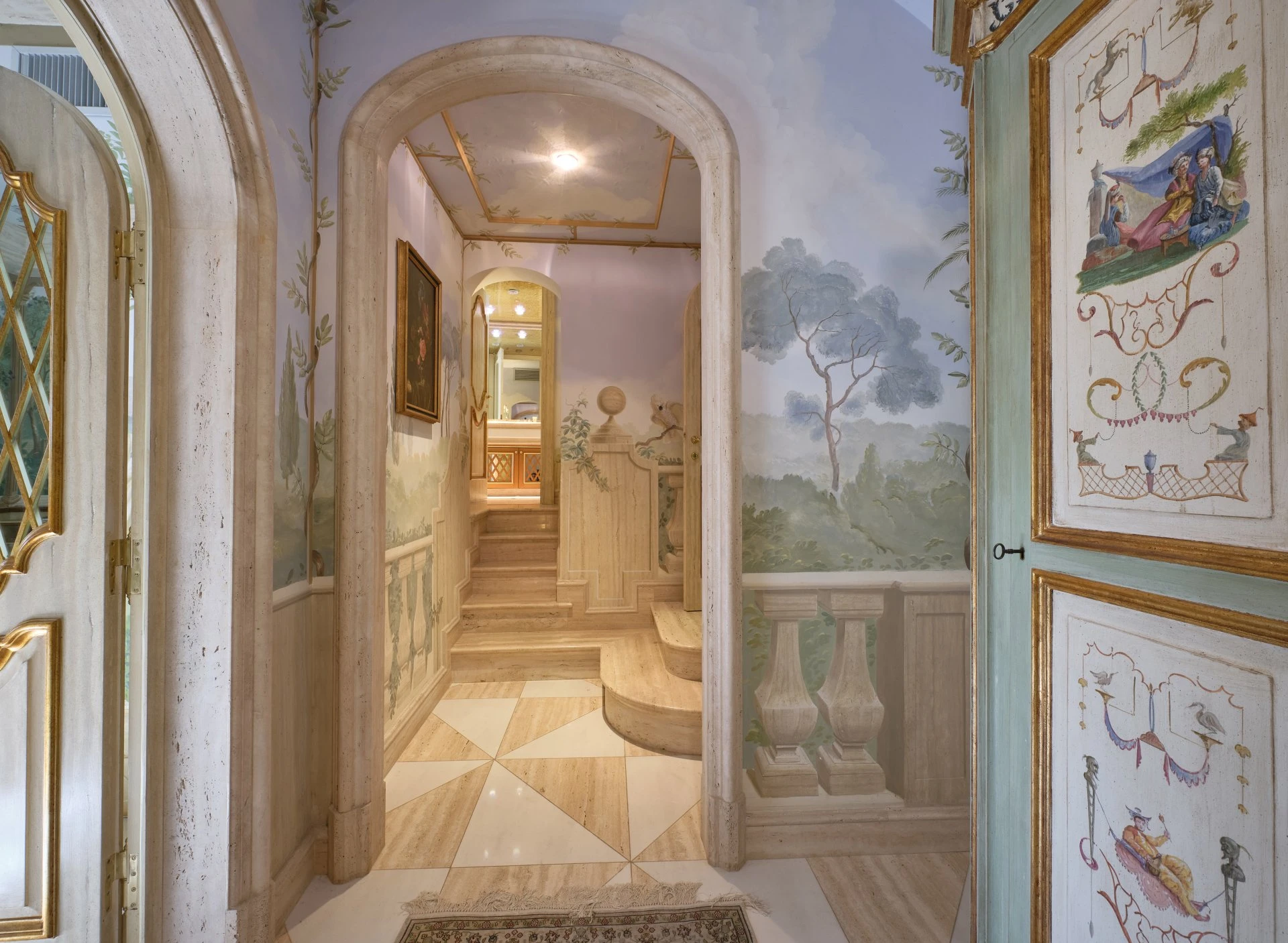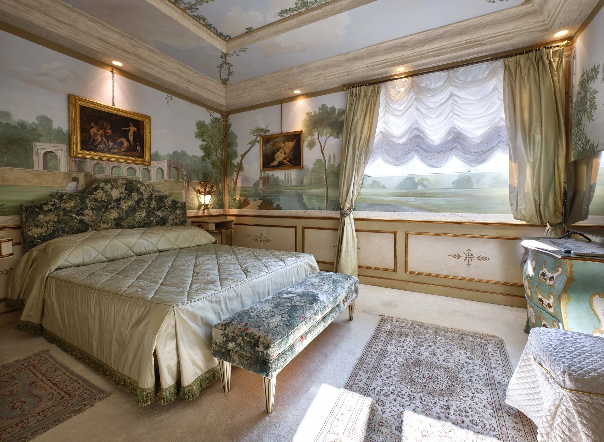 Accessed on the upper floor of the apartment, the second suite provides a peaceful retreat. Wall frescoes created by a famous Italian artist give it a bucolic atmosphere of rare beauty and refinement. This Suite also has a separate entrance, a private bathroom, and a spacious walk-in closet.