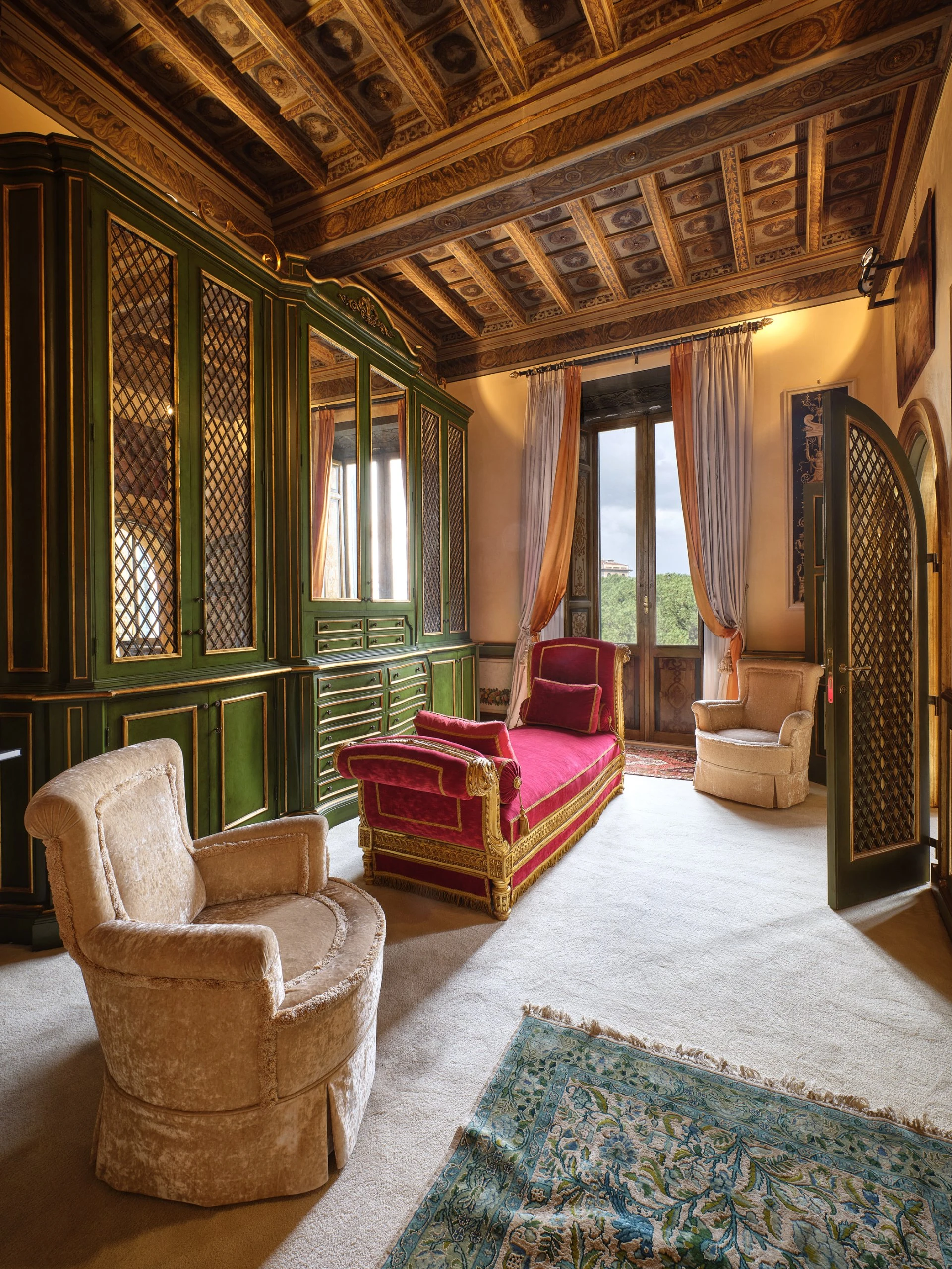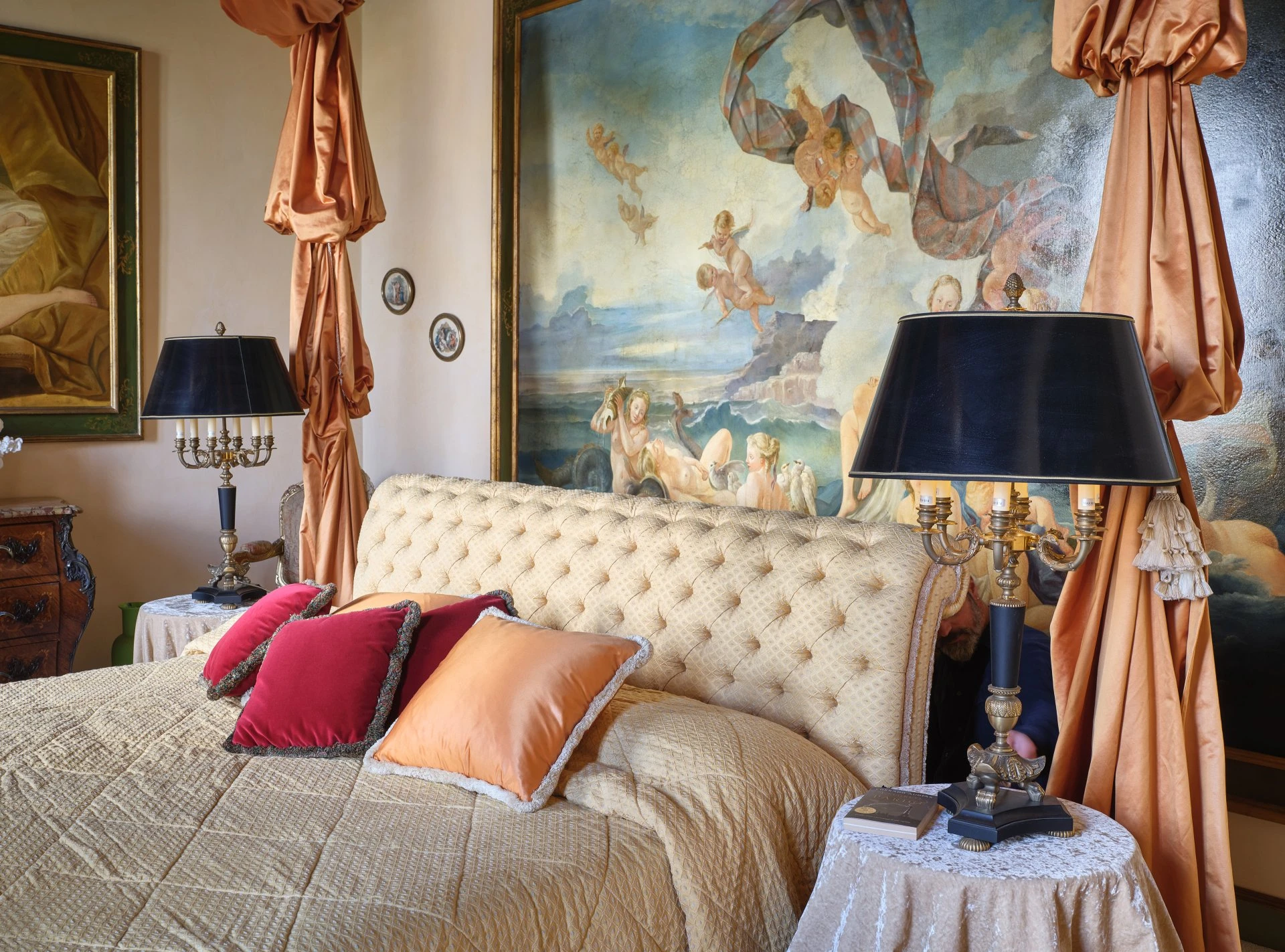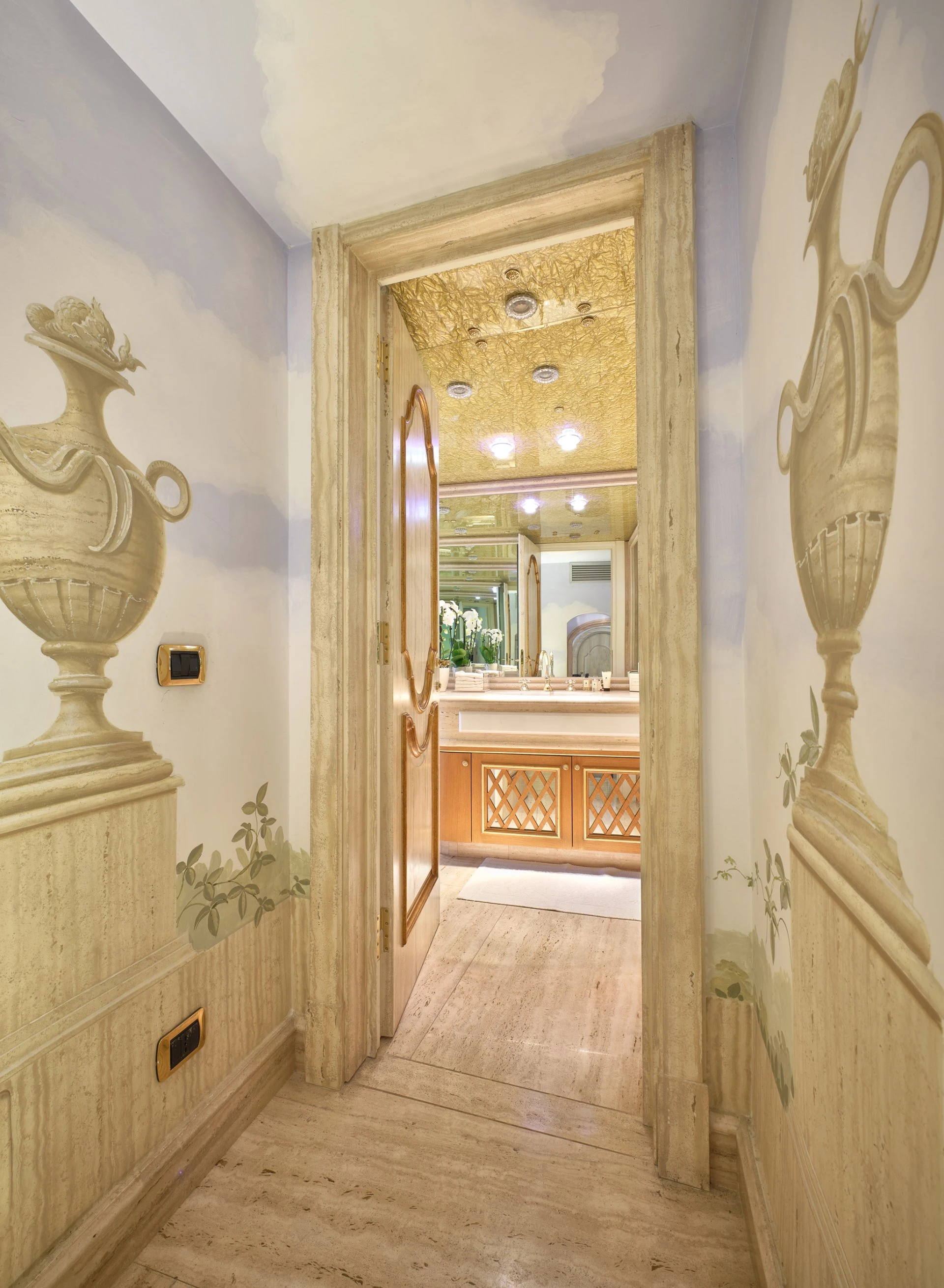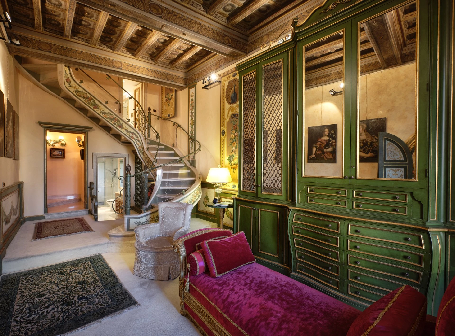 Accessed on the upper floor of the apartment, the second suite provides a peaceful retreat. Wall frescoes created by a famous Italian artist give it a bucolic atmosphere of rare beauty and refinement. This Suite also has a separate entrance, a private bathroom, and a spacious walk-in closet.