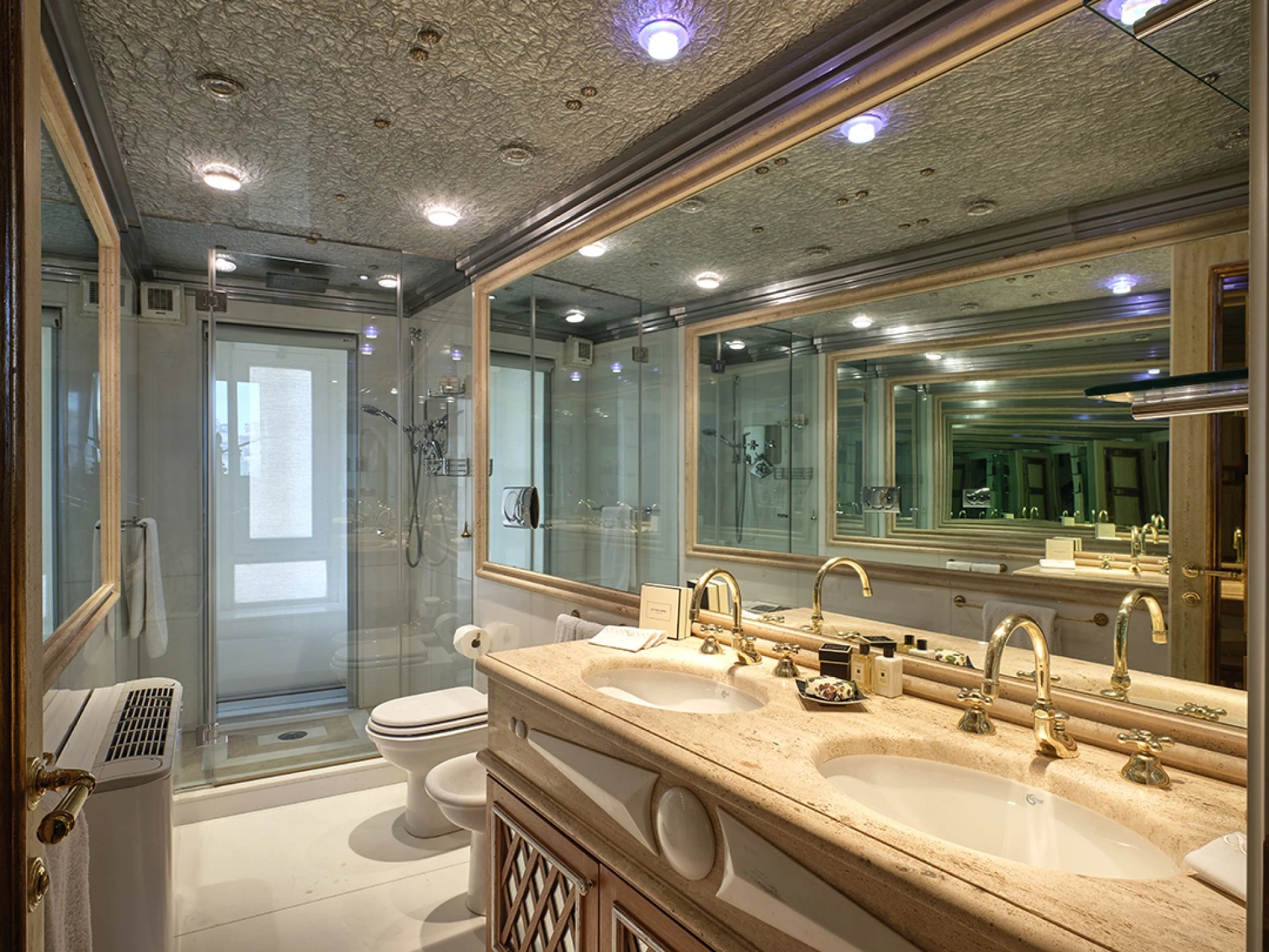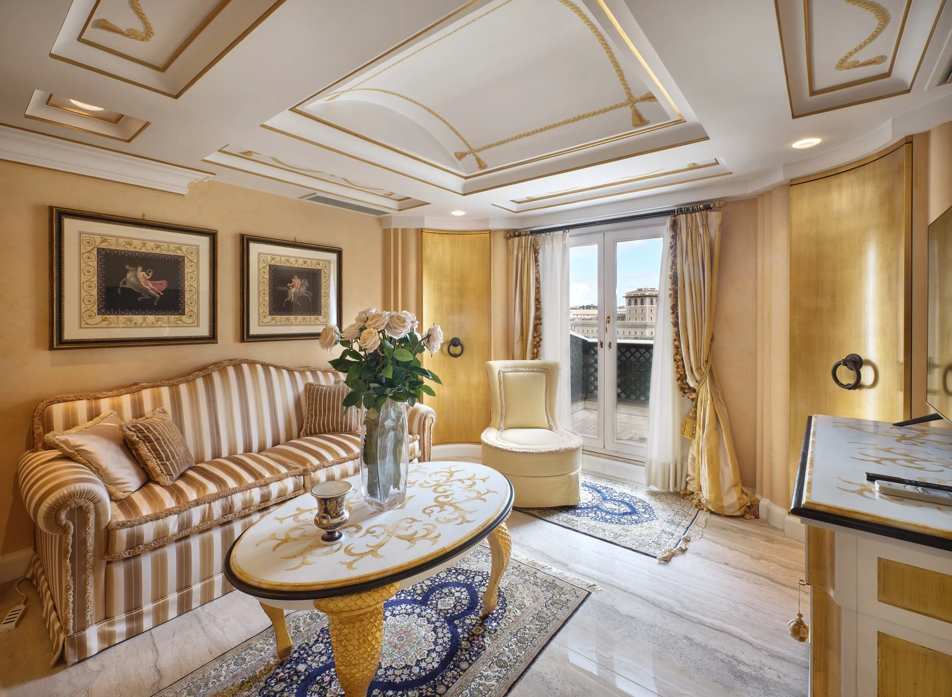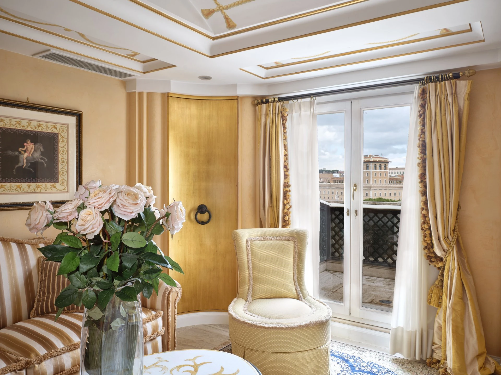 The grandiose Papal suite consists of a bedroom, an antechamber, and two private bathrooms available for guests. Spacious and comfortable, it promises an unprecedented stay. In the living area, ample spaces allow guests to relax in a tranquil and refined atmosphere, admiring, even from here, the incredible scenes of the Capital.