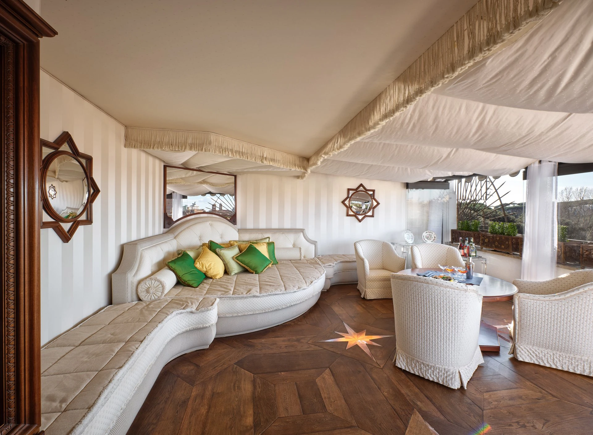 Boasting over 100 square meters of space, the terrace and the exclusive veranda can be easily opened to savor Rome's panorama year-round. This is your ideal space for a vibrant, colorful breakfast, a joyful family lunch, or a romantic dinner tête-à-tête under the stars.